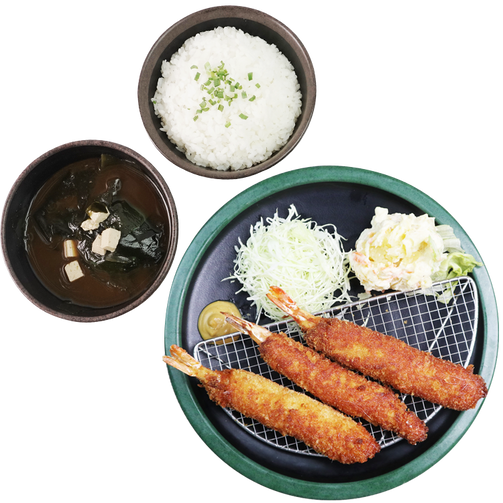 Teishoku set of 3 pcs ebi fry comes with salad, Japanese rice and miso soup. Simple and complete.