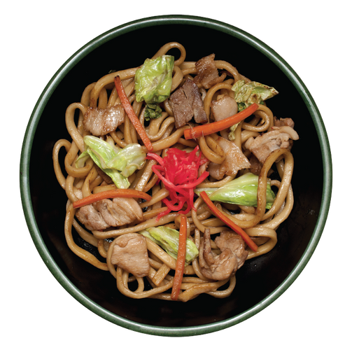 Dry udon noodles with an salty-smokey flavor. Comes with meat and vegetables.